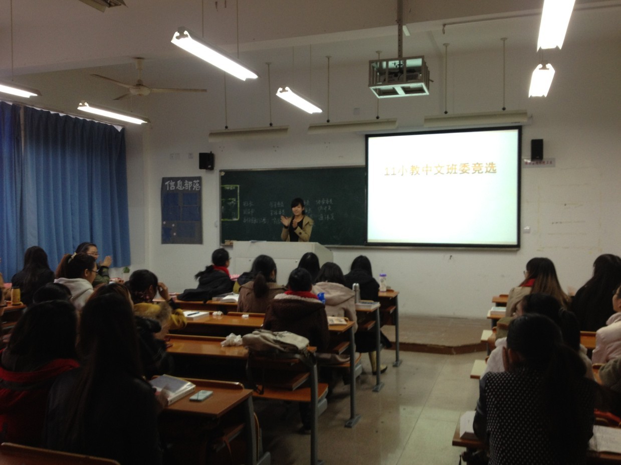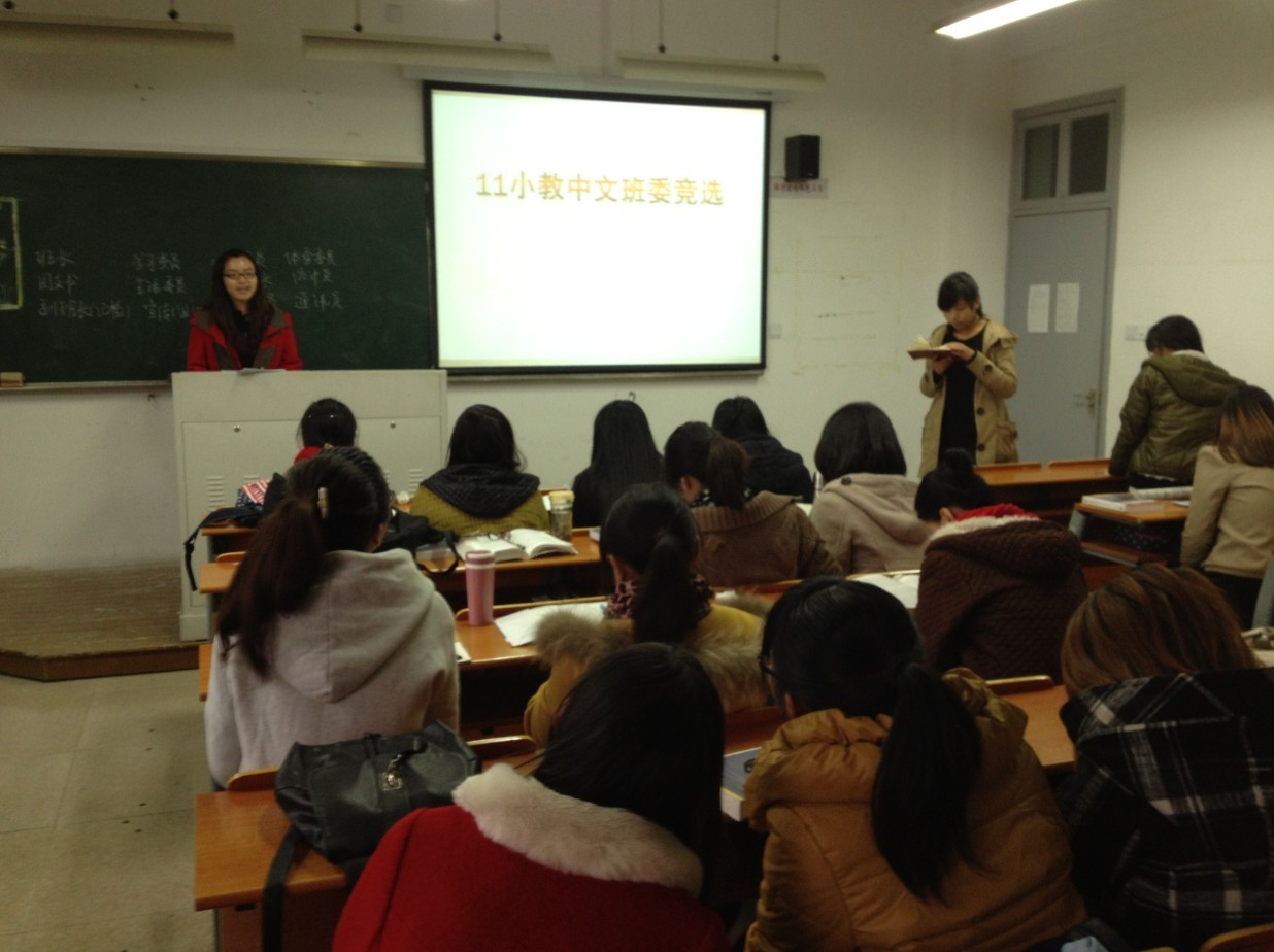 2012年11月28日上午10点,11小教中文班在北校3幢410教室举行了班委竞选。本次活动由周瑞同学主持,班主任张龙老师亲临参加。此次活动共分为三个阶段:第一阶段主题是“第一届班委作总结汇报”;第二阶段的主题是“新班委竞选”;第三阶段主题是“第二届班委发表就职宣言”。