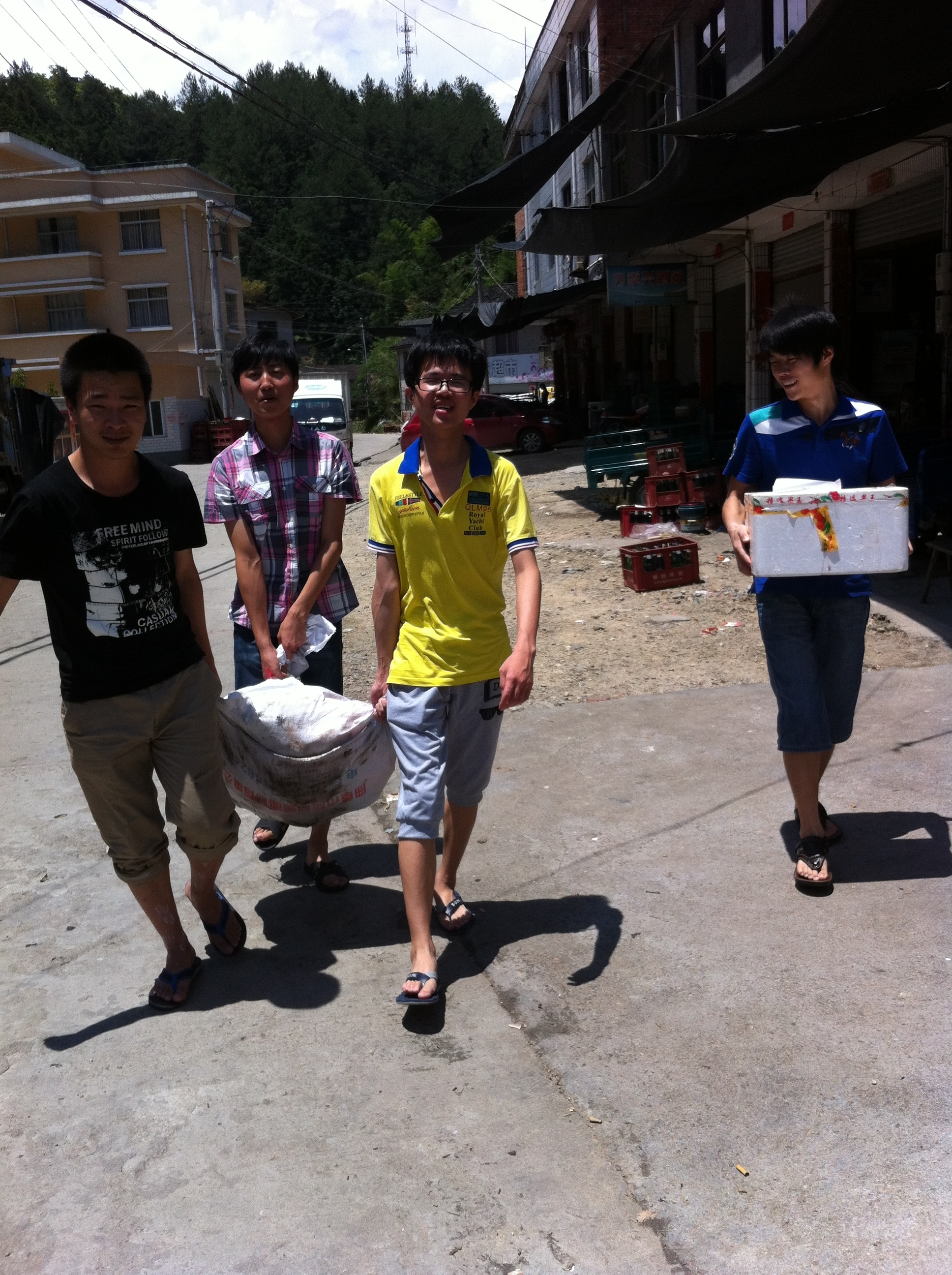 7月8日中午,松阳县安民乡中心小学的校长在千里之外托人给我们送来了蔬菜、肉、水果等食品,财神捕鱼