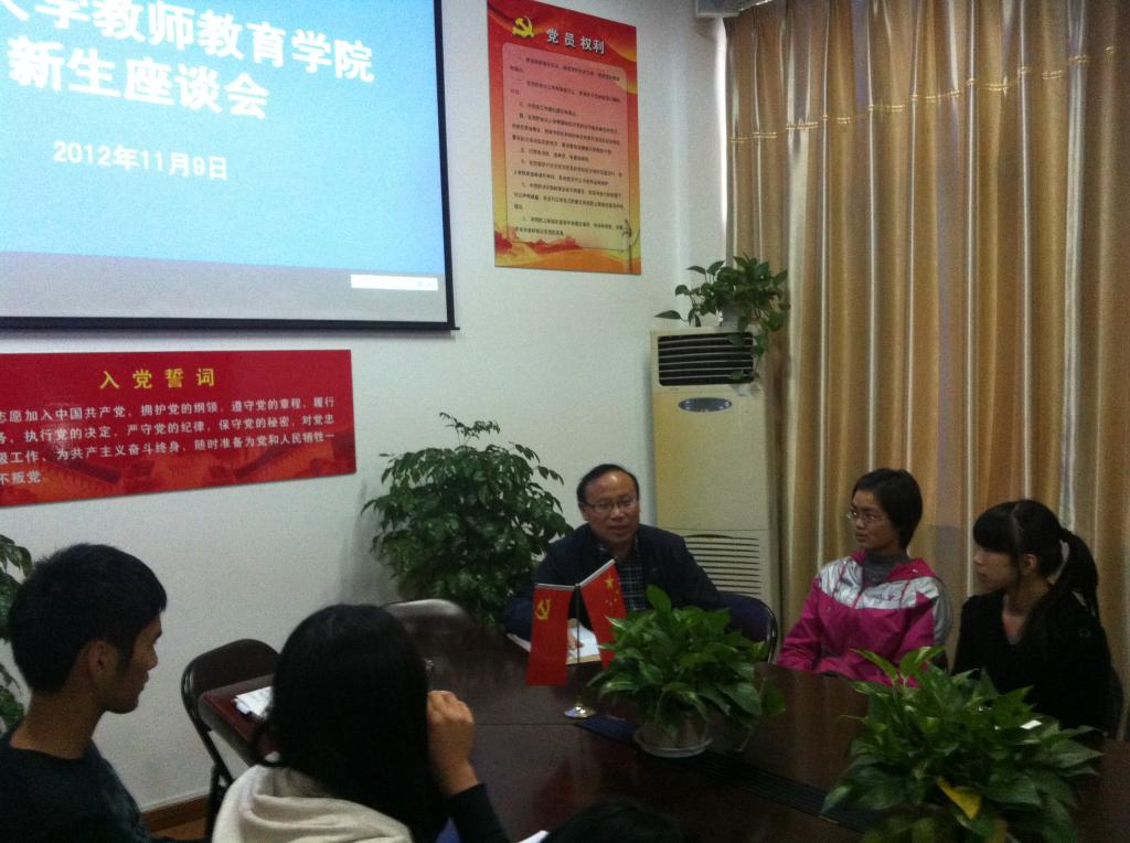党员之家举行,彭小明副院长应邀出席会议。2012级新生入校已有2个多月的时间,同学们对于大学生活的适应情况是彭院长非常关心的问题,他认真听取了新生同学们所提出的大大小小共21个问题,有关小教专业分方向、后勤硬件设施、学区服务、财神捕鱼