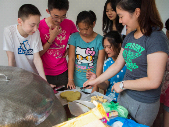 烹饪课在食堂进行。大家分工合作,有的小组做饼干,有的小组做蛋糕,有的小组做披萨。带着满满的兴趣,营员们开工啦!根据制作说明的指示,称取一定质量的面粉、黄油、发酵粉、白糖、鸡蛋等材料,按比例搅拌在一起,一步一步,营员们特别细心。大家也同时分享自己在国外财神捕鱼