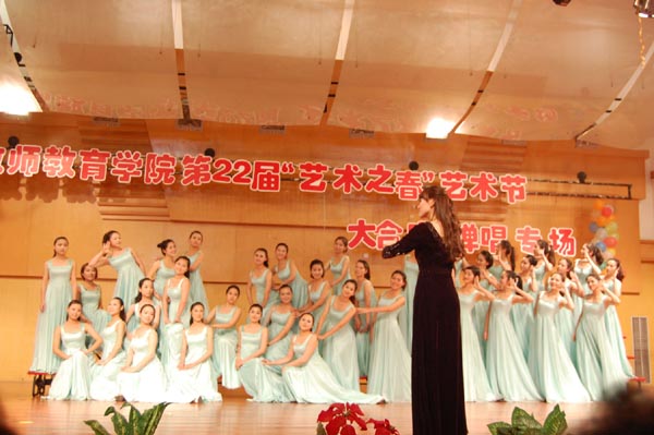 在当天晚上举行的声乐专场中,我们班钟林静同学以一首宋祖英的名曲《天蓝蓝》,获得了全场的好评。精美的服装,深情的演唱,唱出了祖国的大好河山,唱出了人民的美好生活。随后王婵同学与郑科科同学一起表演唱的一首《簸箕上的麻雀》,生动的唱出了一只只活泼可爱的小麻雀偷酒喝的情形,加上精心编排的舞蹈动作,使得这个节目更有看点。最后的儿童表演唱《蓝精灵》吸引了全场所有观众的注意力。在原基础上进行从新创作的歌词,模仿蓝精灵的衣服以及配件,还有同学们动听的歌声,无不让观众为之疯狂,重温了童年的那观看《蓝精灵》时的美好时光。