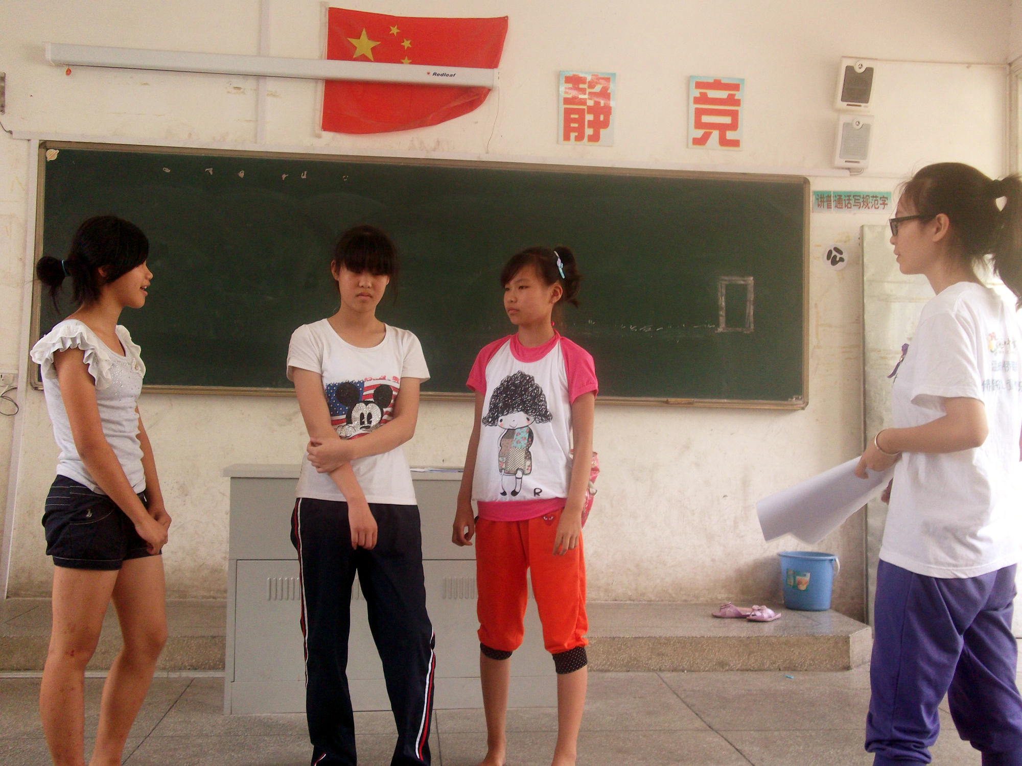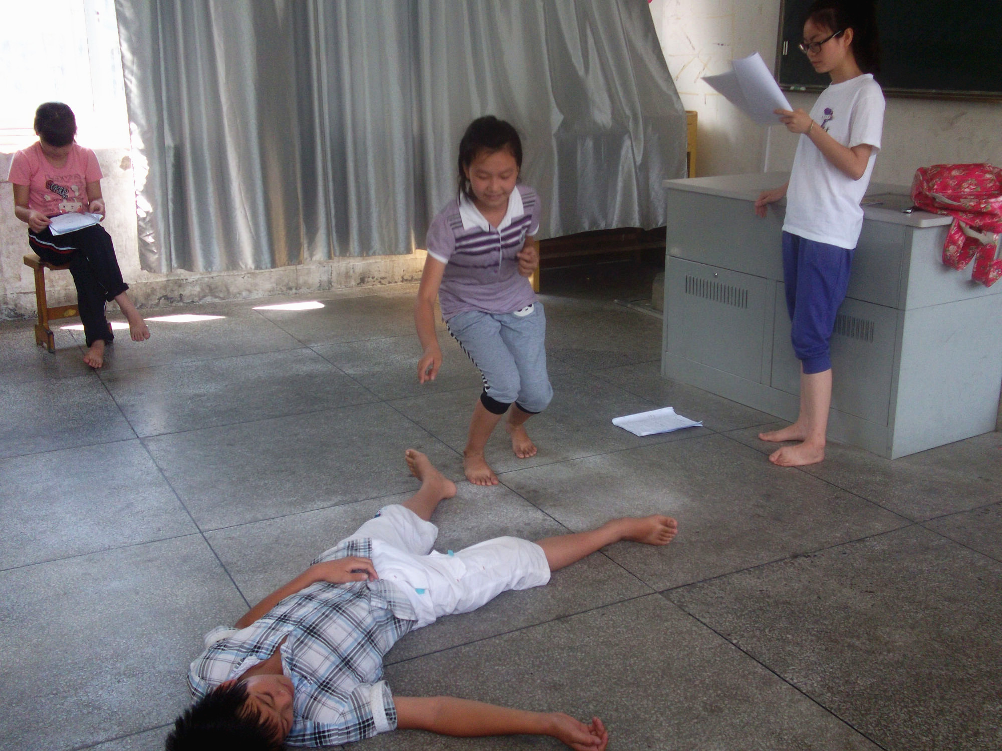 是平顶楼,三楼又是最顶层,所以特别闷热,但是学生们激情洋溢,对于手中的剧本以及自己所要扮演的角色也非常期待,在任课老师的带领下,排练开始了。