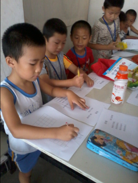 书法课是这一天的头一炮。知心姐姐实践队的队员们根据不同年龄阶段孩子的不同特征分别准备了相应的书法教学材料。小老师林丽娟首先给孩子们在黑板上做书写示范,寥寥几笔,几个大气的楷体字便跃然纸上,使孩子们佩服不已。接下来,丽娟同学向孩子们详细介绍了这些字的笔画顺序,并手把手地辅导学生写好每一个字。孩子们的课堂表现也十分活跃,不少孩子一连写了三四张字体练习,同时积极地请老师对自己的字进行指导。在课堂的最后,她对孩子们的书法作品做了针对性的讲评并提出了相关的改进建议,一些好的作品也被粘贴到教室的作品欣赏角处进行展览。