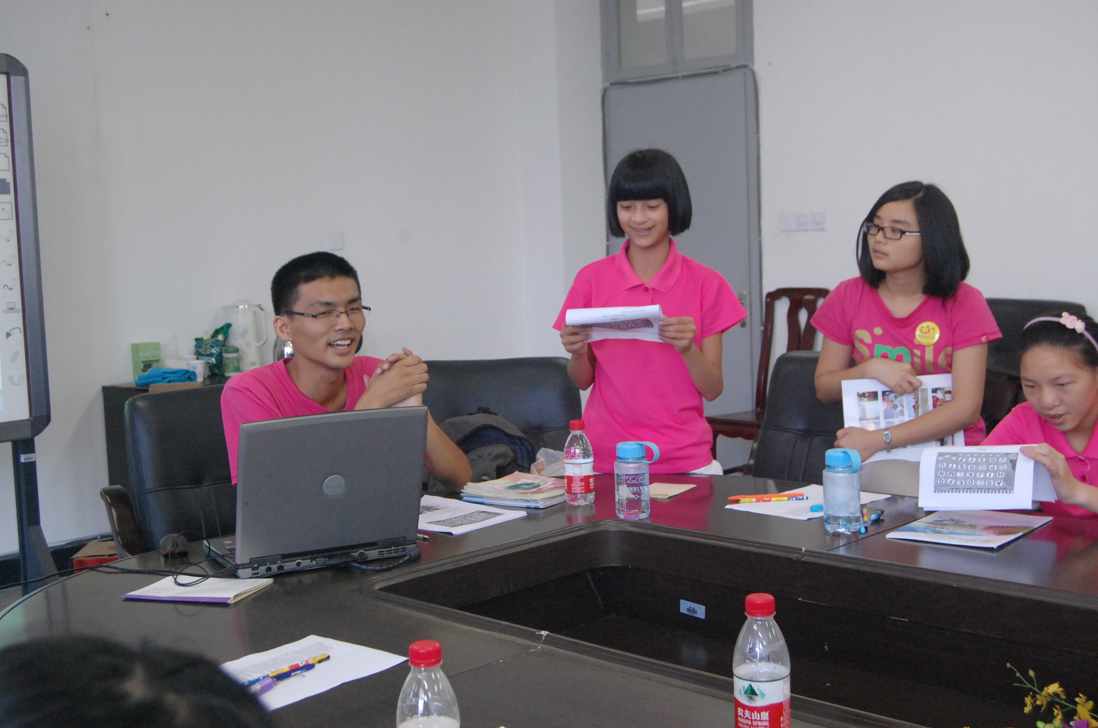 倪安品队长是本次活动的主持人。在活动中他充分调动自己的知识,教了小营员们外语。先是大家熟悉的英语,有些比较小的孩子还没认全26个字母,英语课就从基础的开始,随后一段《no body》更是将大家的情绪推向高潮。倪安品队长又教了几句简单的实用性韩语,比如说“你好”、“谢谢你”等,小营员们学得不亦乐乎,虽然说得不是很好,但是他们从中感受到了许多快乐,这就足够了。