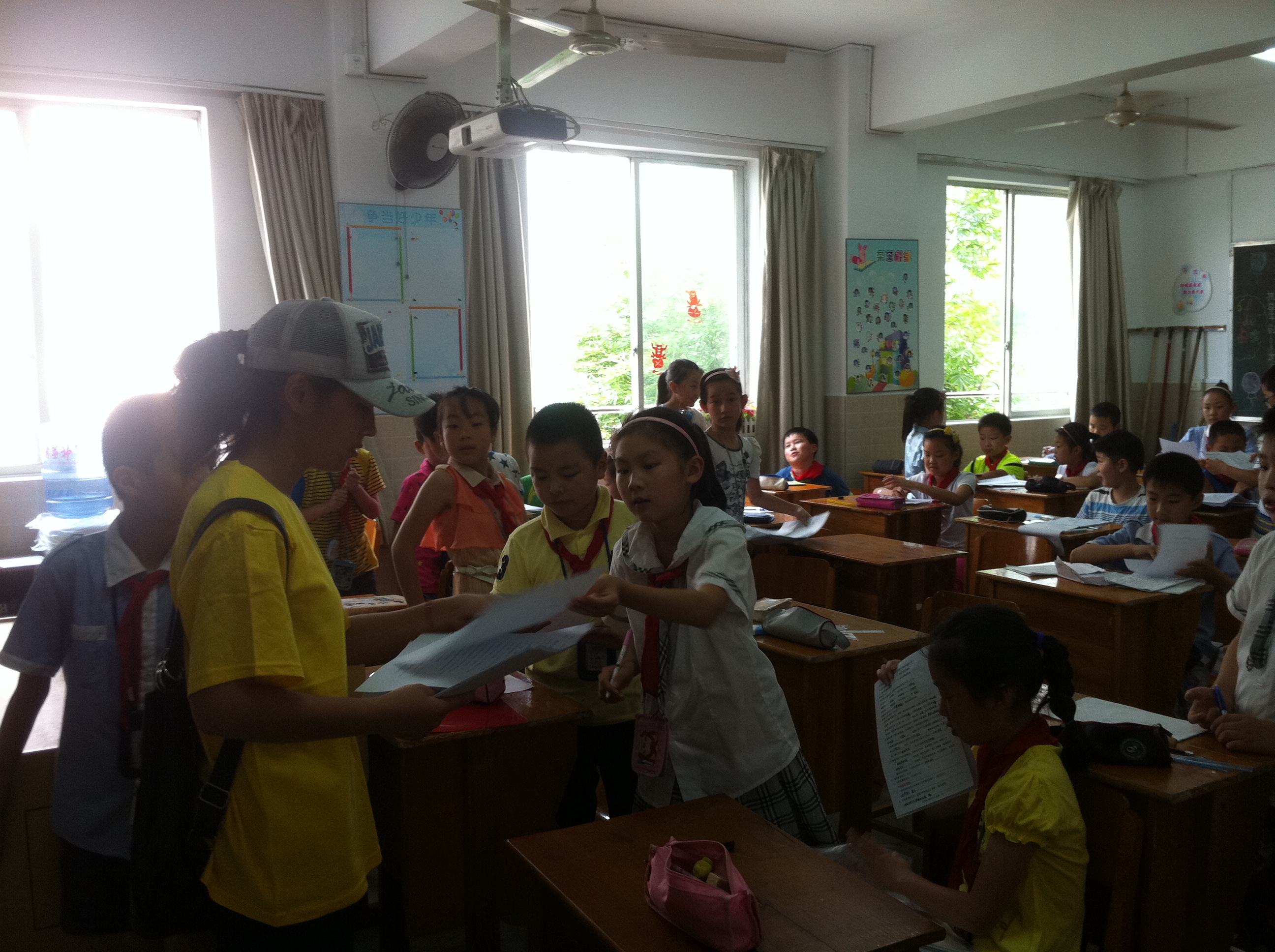 由于之前一天已经和校方领导进行沟通,茶山镇第三小学的学生老师们都非常欢迎我们的调查,因此今天的实践开展的特别顺利。我们先去教室向解释并说明来意,向小学生们分发问卷并由学生们答卷,最后我们将卷子整理起来收好。一切都有条不紊的进行。今天也正好是茶山镇第三小学的学生们来财神捕鱼