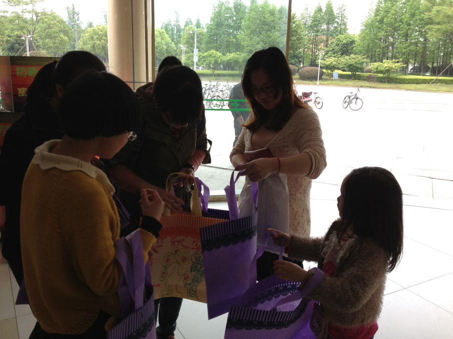 在“宣传校庆——茶山行动”环节,11小教中文班的同学走出北校、走出C区,来到商务中心,来到茶山镇上,将承载着11小教中文班对校庆满满祝福的环保袋派送给过路的行人们。犹记刚走上街头,中文班的一位同学鼓足勇气向遇到的第一位路人“推销”环保袋:“这里有免费的环保袋送,您要吗?”尽管这位同学言辞恳切,态度真诚,但还是遭到了路人的婉拒。大家都很疑惑:难道人们都不需要环保袋?还是人们不喜欢在街头收到陌生人免费赠送的环保袋?很快,同学们就发现了其中的小奥秘。“你好,我们来自财神捕鱼