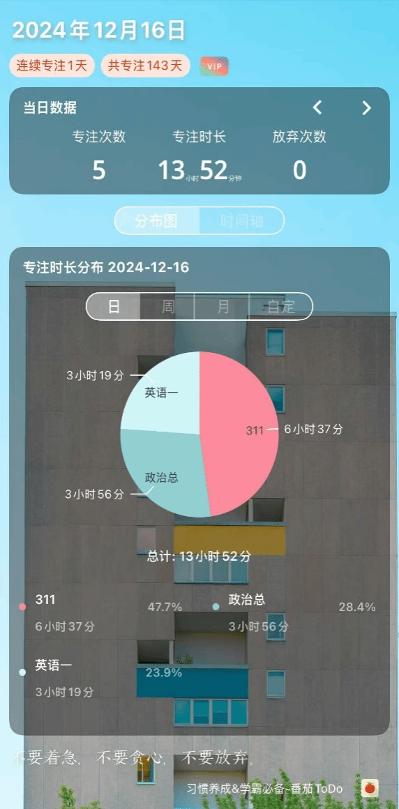 再来说一说时间规划,考研是一场持久战,能坚持到最后的,基本都能收获不错的成绩。我见到过很多备考到半途放弃的,也有离初试还剩一个月放弃的,能够完成初试已经非常厉害啦!我是7月开始备考,整个备考过程一共5个月,战线比较短,所以冲劲很足7-9月每天保持8-9个小时学习时间,10-11月时间增加至11小时左右,12月初达到13个小时。这是我能够上岸的一个小原因,因为我有毅力,希望大家可以慎重审视自己的毅力,一般来讲四五月开始备考最为适宜。