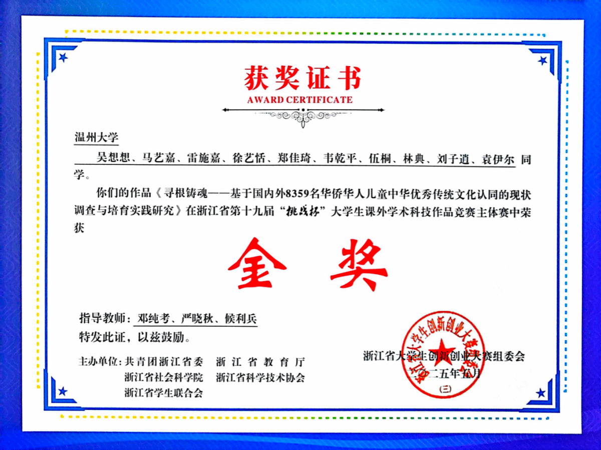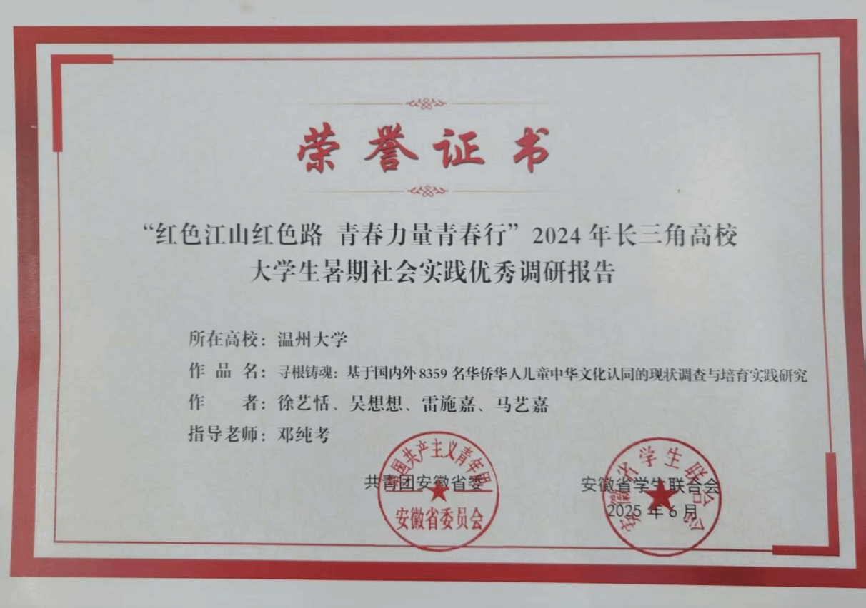 学科竞赛中,她以核心成员身份获浙江省第十九届“挑战杯”大学生课外学术科技作品竞赛主体赛金奖,带领团队斩获长三角高校暑期社会实践优秀调研报告;主持省级大创项目1项,在全国大学生英语竞赛、“新湖杯”创新大赛、中华经典诵写讲大赛等赛事中屡获校级奖项,师范技能竞赛连续两年获奖。