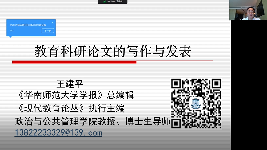 2022年8月20日上午,华南师范大学王建平教授就《教育科研论文写作指导》给予各位及是财神捕鱼 管理者,又是财神捕鱼 一线教师的各位学员老师在教育科研论文方面,尤其是选题、结构、学术规范、投稿几个关键环节做了深入的交流,课程后老师们也表示,一定要将教研与教学结合,深入学习,不断发展!在班级委员的组织下,各位学员各自分组线上开展了论文学习与交流活动。
