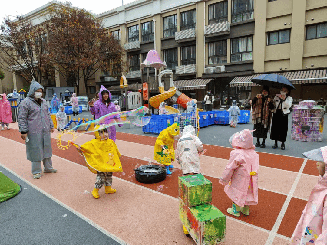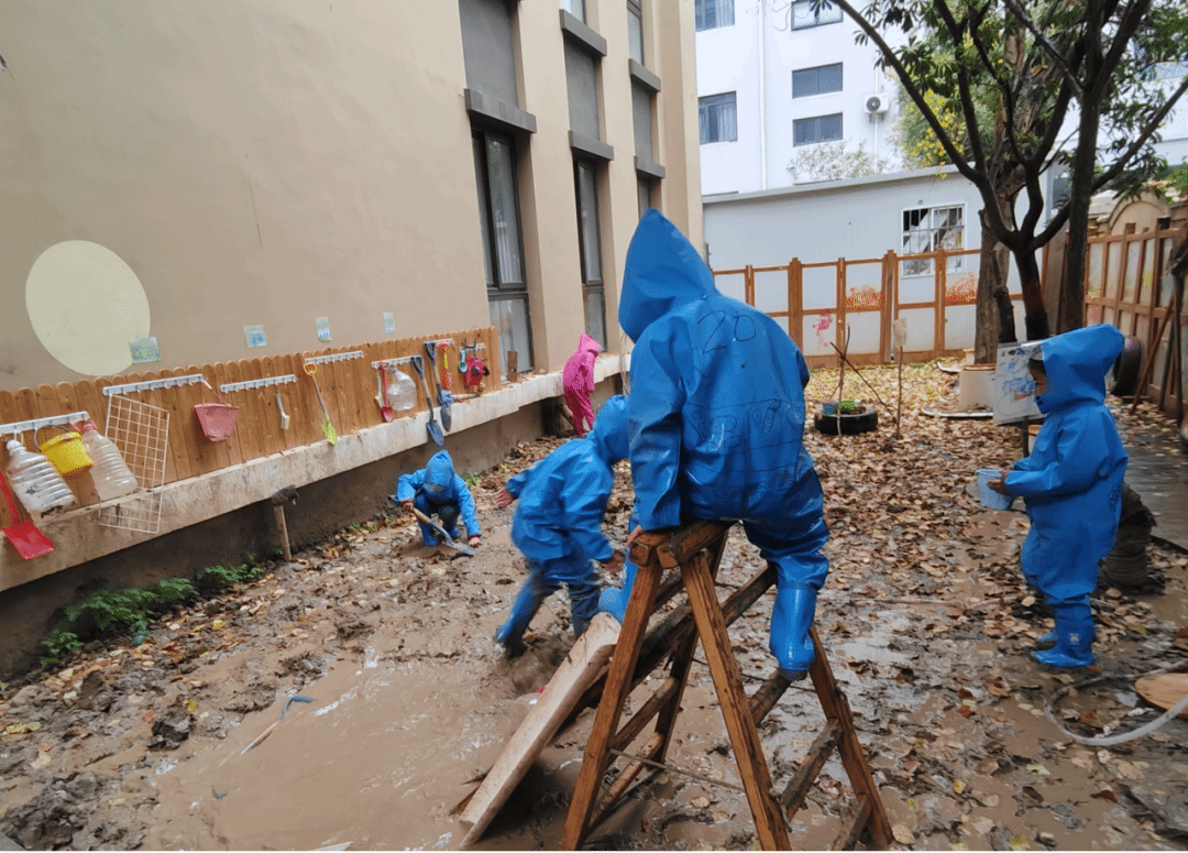 观摩幼儿户外游戏环节时,我们看到了孩子们在沙池里开挖沟渠,在水池里自由徜徉,在搭建区利用亿童积木搭建出奇思妙想,在细雨中乐享野餐....孩子们不管恶劣的天气,依然保有游戏的热情,且在游戏中闪耀着专注投入、自主探索、互助合作等学习品质,令园长班学员们感受到孩子们在游戏中的生命力量。