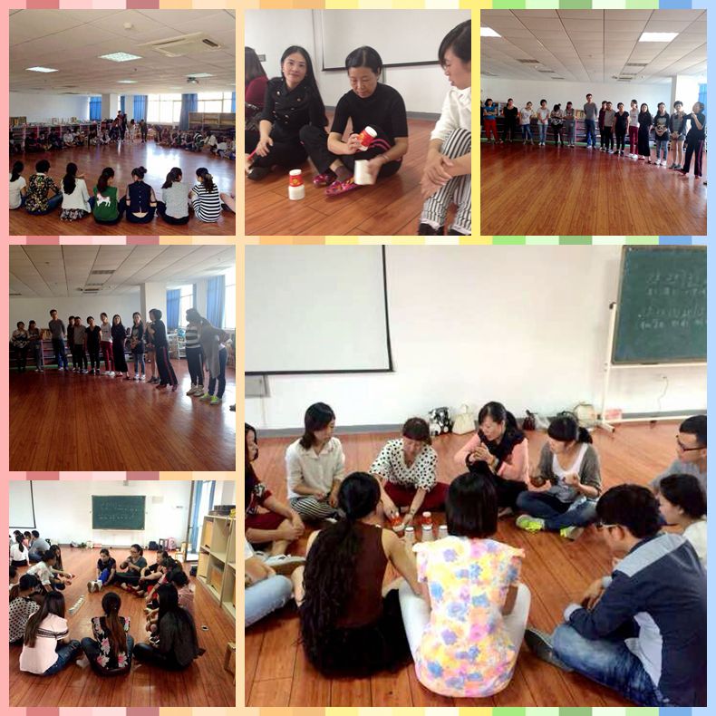 林炎琴老师说:“音乐游戏源自于孩子们的日常生活”,下午的音乐课堂中,林老师即兴用幼儿园日常生活午餐中的菜谱——“土豆”编出了一首孩子们喜闻乐见的节奏感极强的儿歌:“土豆儿皮皮,土豆儿丝- 土豆儿皮、土豆儿丝,土豆儿皮丝。”她先让学员们盘地而坐群体练习节奏,接着进行双人互动练习和起立互相拍手游戏练习,之后她又运用了节奏的改变,用一次性杯子进行分组变奏的练习,还用一种拍打肢体游戏的动作来完美演绎了四拍子和三拍子的节奏。刚开始手忙脚乱的学员们,在林老师的指导下都迅速进入了状态,并进行认真有序的节奏感和匀速感的游戏练习。