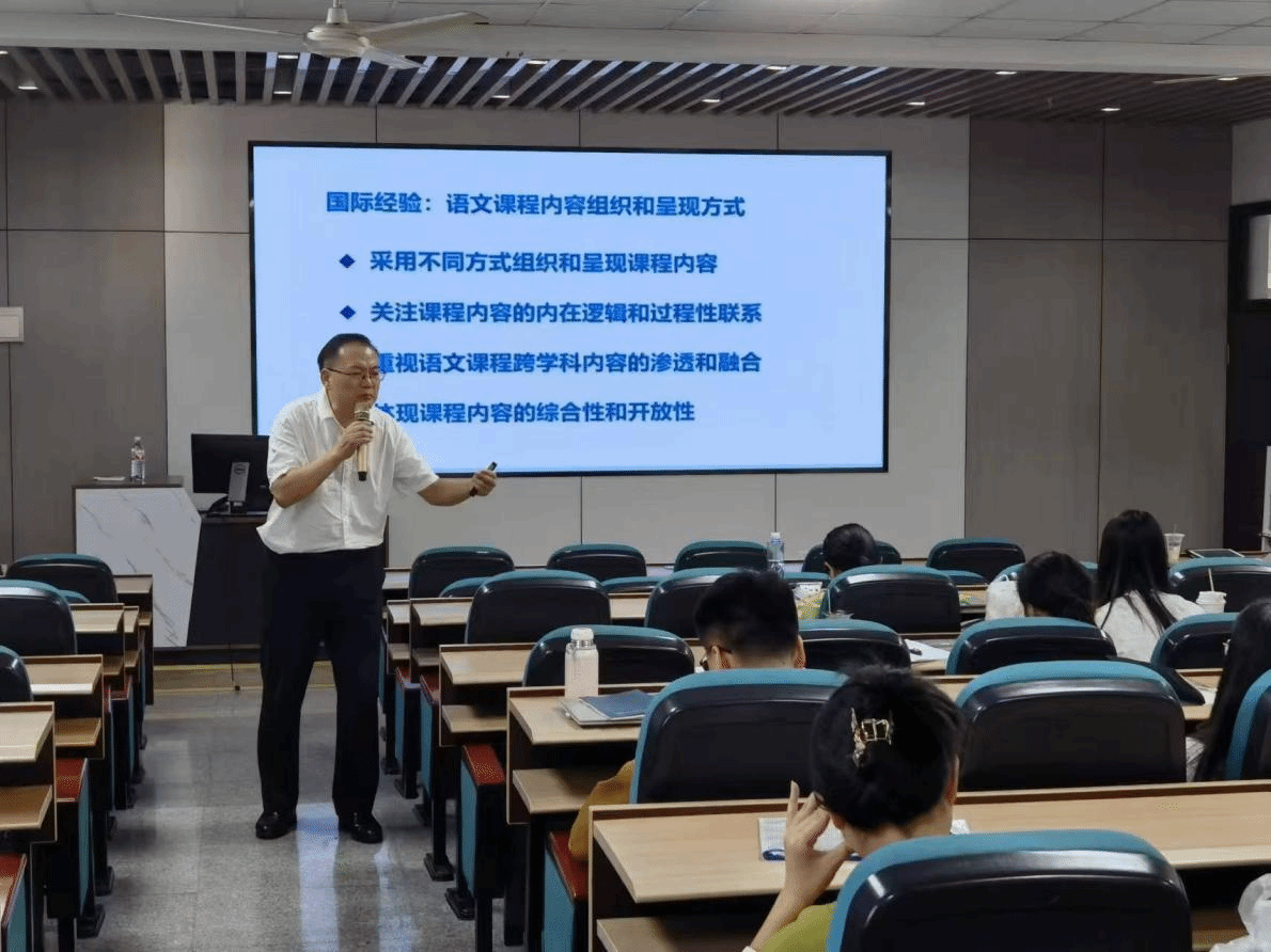 下午李季教师作了题为《基于语文要素、学习任务群、大单元的单篇课文教学设计案例展评》的讲座,李老师从单篇—单元—专题出发为学员讲解了教学设计要点,立足于课程标准解读课文教学设计的侧重点。他认为语文教学设计应结合语文课程内容体系的构建,理解核心素养与语文学习任务群之间的关系。讲座中,李老师以典型案例,广博的文本拓展,严谨又不失幽默的语言,引领学员沉浸式地进入单篇课文教学设计的世界,拓宽了学员单篇课文教学设计思路,提升了学员教育专业素养。