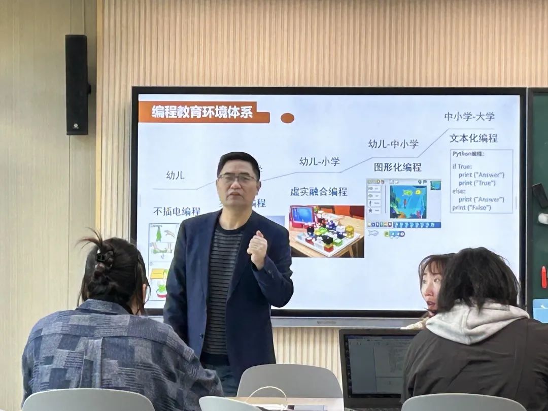 胡来林教授向老师们分享了幼儿编程教育中的计算思维培养、幼儿游戏化编程教学活动设计与实施流程。从活动目标、活动准备、课堂导入、探究活动以及总结延伸五个方面详细地讲述了游戏化编程游戏化教学活动的有效设计与实施,还介绍了整合幼儿园传统材料开展跨学科项目化幼儿编程教育的方法。