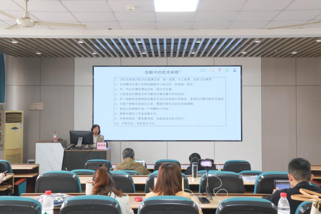 3月17日下午温州市龙湾区教师发展中心江晓静主任以《统整·重构:校本研修精品课程的精彩蝶变》为题,分享了区域性校本研修课程建设先进经验。江主任在讲座前利用“何为校本研修?”“为什么我们要做校本研修?”“我们研什么?”三个问题为开展,从校本研修的“难题”为切入口,帮助教师们重新梳理校本研修的流程。