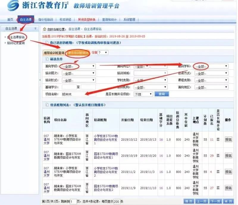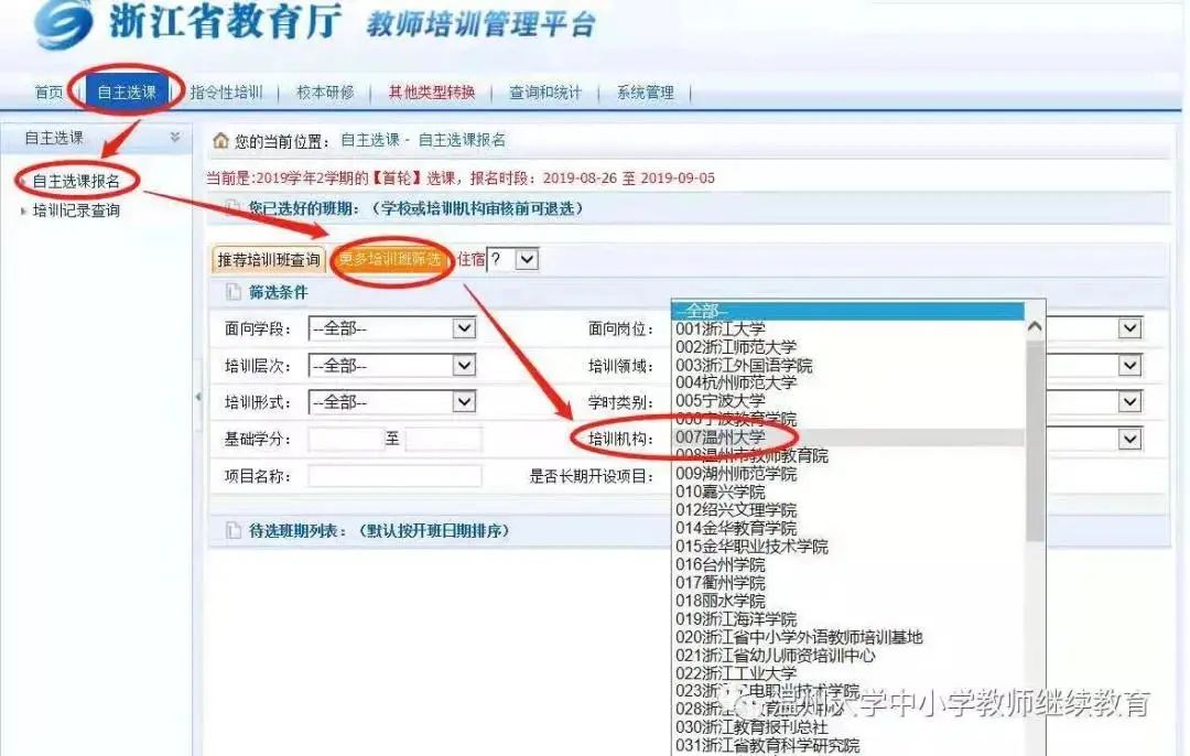 (//pxglpt.zjedu.gov.cn)—自主选课—自主选课报名—更多培训班筛选(培训机构—财神捕鱼