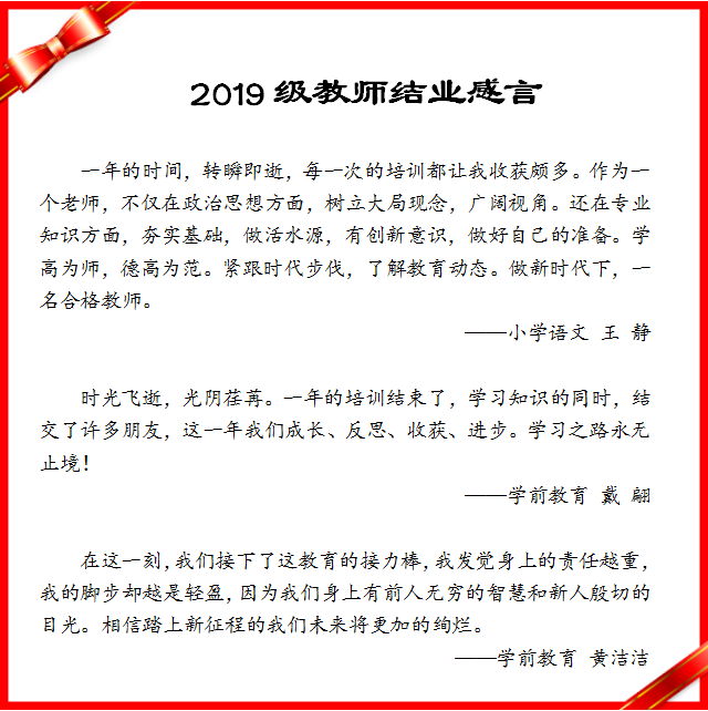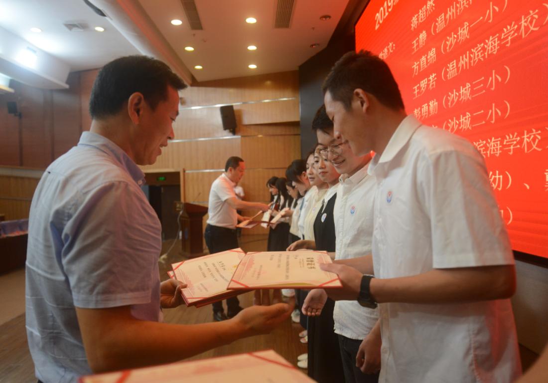 典礼上2019级11名优秀学员上台领取荣誉证书。这份荣誉,不仅仅是对他们过去一年勤恳努力、不断提升自我的一种肯定,更是一股催人向上的动力。优秀学员是2019级新教师中奋发、向上的代表,更是2020级新教师的榜样。奋进的精神在表彰中传递,激励我们以飞扬的激情去点燃青春之火,用充满朝气的激情去拥抱明天的太阳!