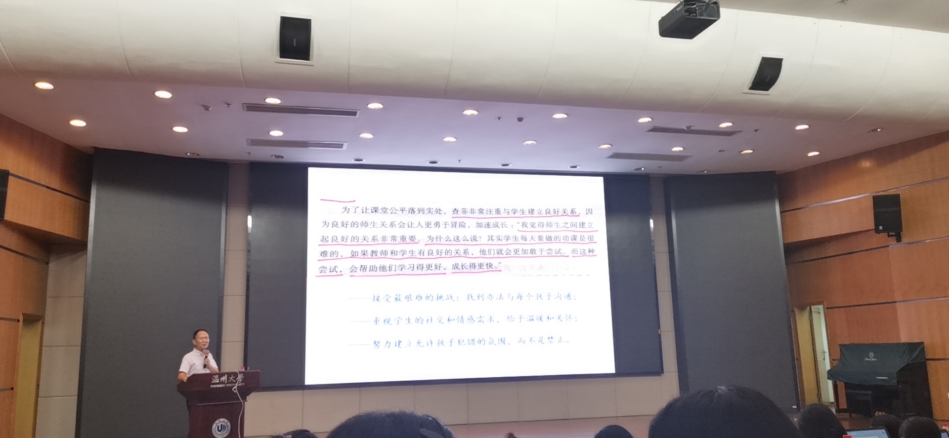温州市教育局党委委员、专职副总督学倪彤老师以“以伟大的心做微小的事”为专题带领全体2020级新教师就教育这一话题在讲座中展开讨论。她从内在品得、班级管理、教学能力等各方面着手,利用生动的例子为新教师们梳理了一个“好老师”必备的专业素养,并鼓励新教师们在学习中增添教书的底气和实力。