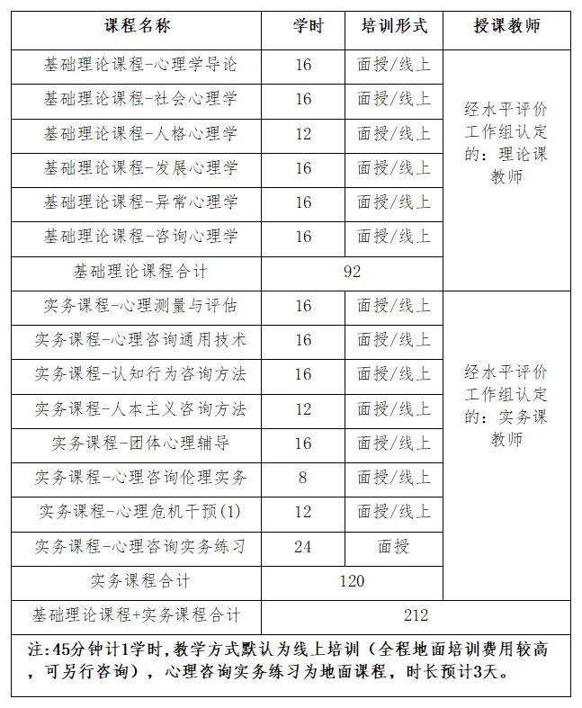 心理咨询师三级培训共212学时,包括基础理论课程92学时,实务课程120学时。