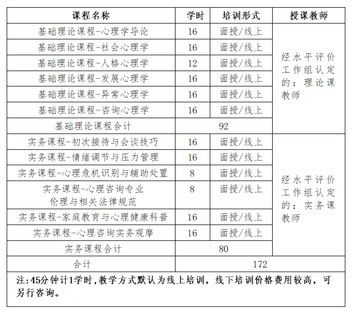 心理咨询师四级培训共172学时,包括基础理论课程、实务课程。