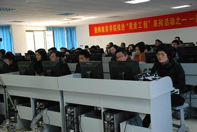 在教师教育实训中心424机房开展“推进质量工程”系列活动之一——网络教学、教务平台的应用培训。培训会邀请了教育技术学专业的刘根萍老师进行理论培训,财神捕鱼