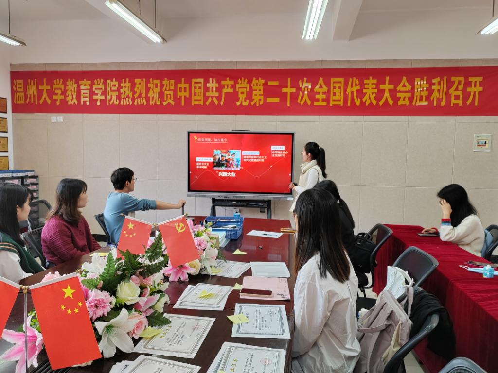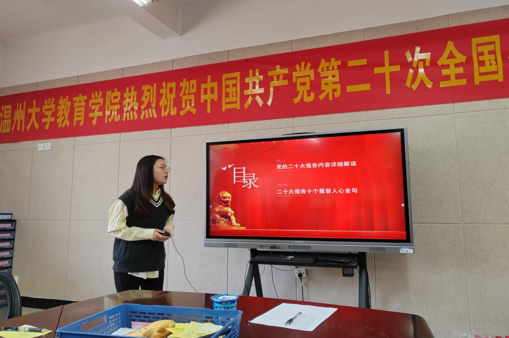 吴可同志、申屠佳怡同志、杨小碟同志也发表了自己的看法与见解。从解读“五个牢牢把握”,阐述“两个确立”的决定性意义,到《中国共产党章程》修改对比,板块划分明确,逻辑清晰,而总结性的陈述更是让与会党员们对党的二十大精神有了更加深刻的理解与感触。