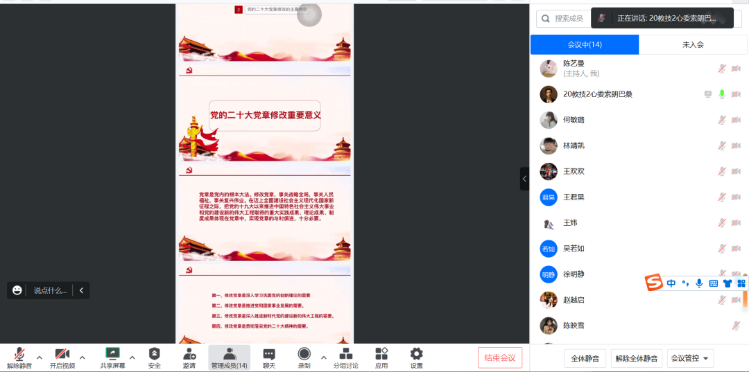 索朗巴桑同志进行关于《深刻领会党的二十大党章修正案的重大意义与重要内容》的学习分享。修改党章不仅是深入学习巩固党的创新理论的需要,还是推进党和国家事业发展的需要。他认为党员应当切实把党章各项规定要求落实到行动上、体现在工作中,切实维护好党章的严肃性和权威性,为全面建成社会主义现代化强国而团结奋斗。