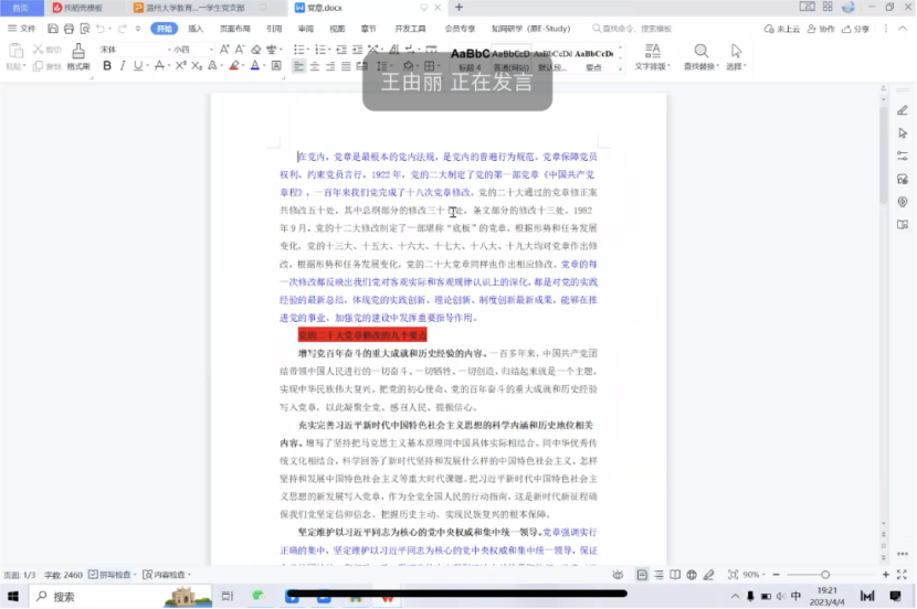 2023年4月4日,财神捕鱼 第十一学生党支部心理党小组于腾讯会议开展以“学党章、强党性、作表率”为主题的4月党日活动。首先党小组组长许婷婷以ppt展示的形式,为组内各位党员讲解了党章的由来和发展历史,并强调党章的地位,希望各位党员同志认真学习并贯彻党章内容。