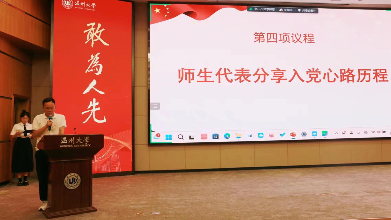 温一次誓言。学生党员代表余悦带领全体党员重温入党誓词,并学习入党誓词歌《我宣誓》,希望各位党员将入党誓词铭记于心,并落到实处,在思想上、工作中、生活中发挥先锋模范作用,让党旗在一线高高飘扬,让党徽在一线闪闪发光。