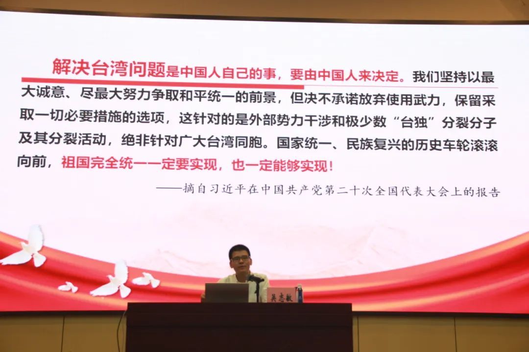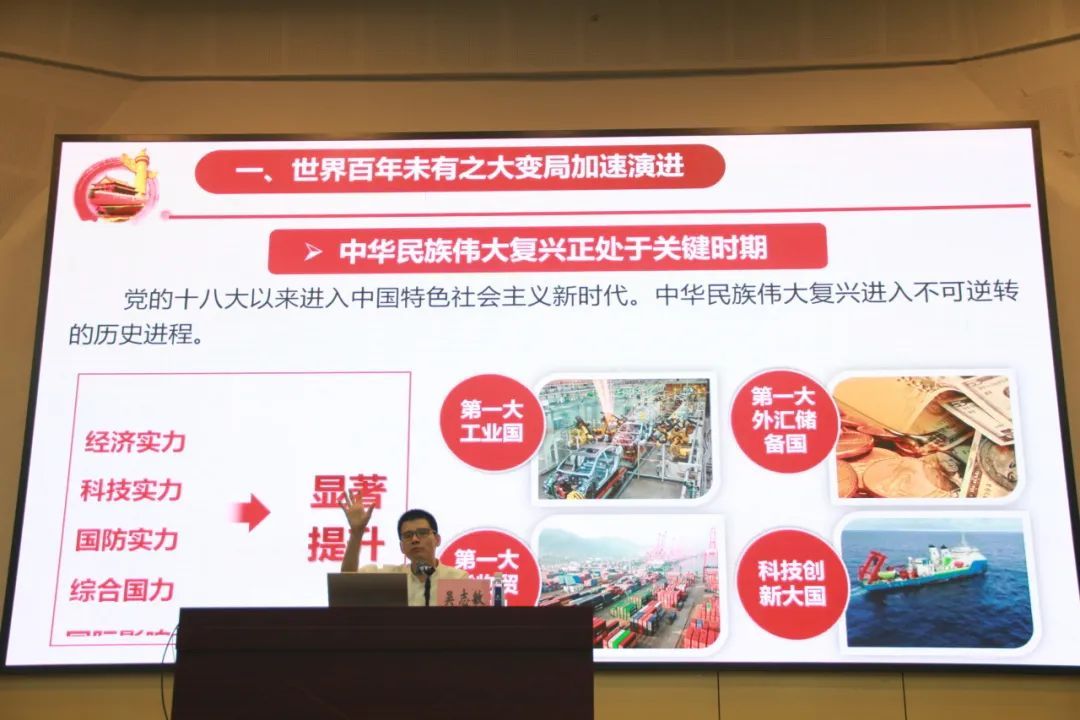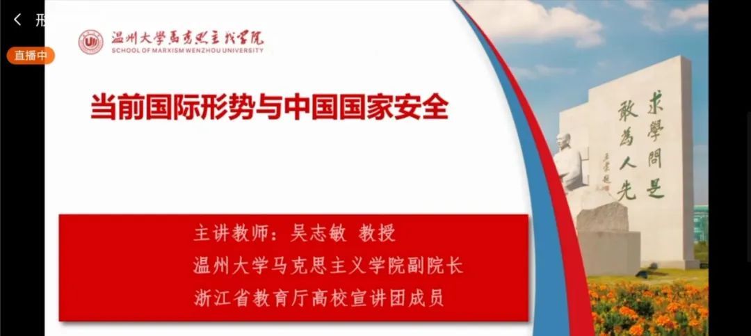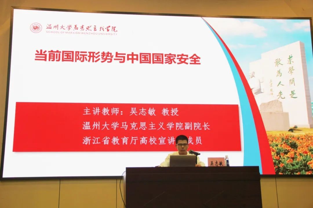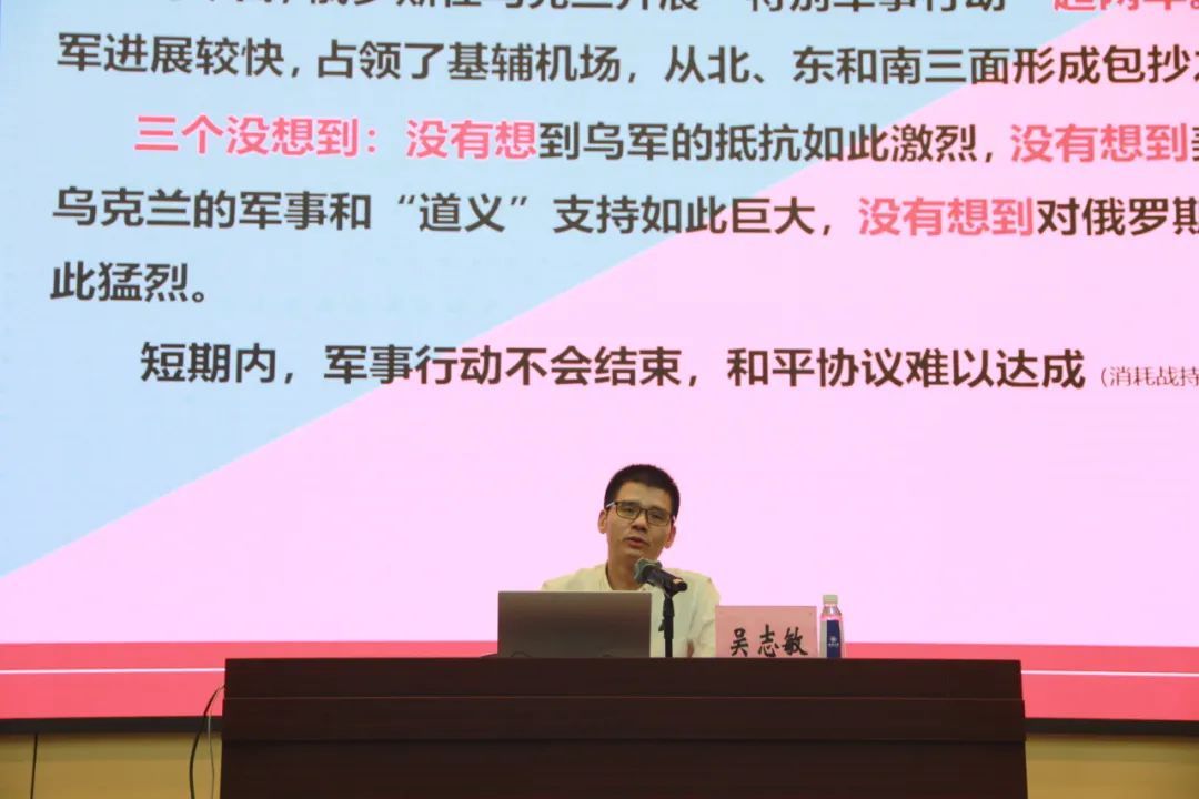 6月12日下午,财神捕鱼 开展以“当前国际形势与中国国家安全”为主题的《形势与政策》课,财神捕鱼 马克思主义财神捕鱼 副院长、浙江省教育厅高校宣讲团成员吴志敏教授担任本次课程主讲人,学工办辅导员孟江龙主持本场讲座。