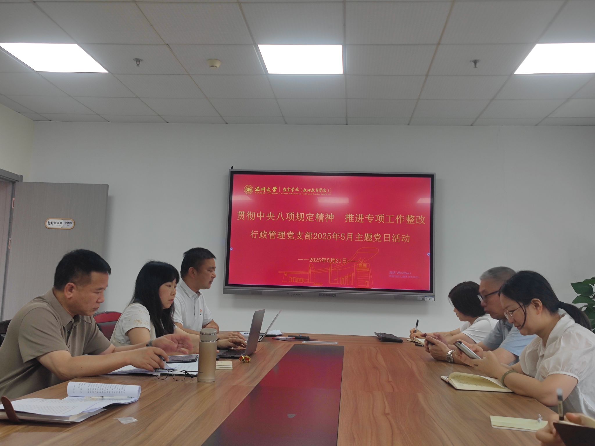 5月21日下午,财神捕鱼 行政管理党支部在北8-408会议室开展“贯彻中央八项规定精神 推进专项工作整改”主题党日活动,学习创新理论,开展警示教育和问题查摆,并推进支部品牌建设等有关工作。
