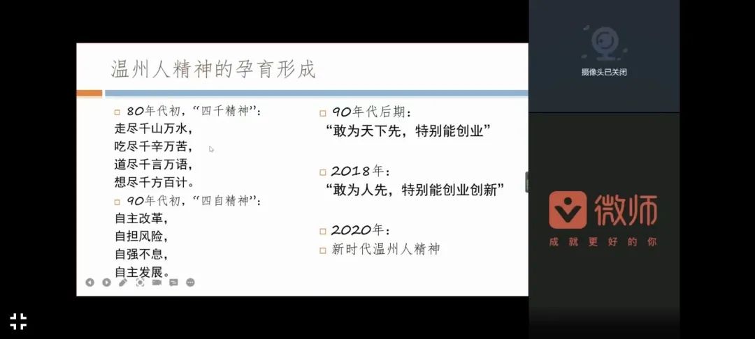 “温州好,别是一乾坤。”孙邦金教授围绕温州是个好地方、温州改革开放史、温州人精神的核心内涵、激扬新时代温州人精神等四个方面开讲。他从温州的自然环境和地域特色两方面介绍了温州是个好地方且培养出一批具有生存智慧的温州人。他带领教院学子回顾了温州改革开放的历程:温州基于历史与现实的条件下选择了“工商立市”;1877年温州改革开埠,为政治、经济、文化领域带来新气息;1984年温州被确定为首批十四个沿海开放城市之一,成为改革开放先行区;温州是民营经济的发祥地,现在是中国民营经济示范城市之一。孙邦金老师还分享了三部有关费孝通对温州模式研究的著作——《小商品大市场》《家底实创新业》《筑码头闯天下》,凸显温州模式的研究,温州模式成为中国改革的一面旗帜。他还揭示温州人精神的核心内涵在于“敢为人先、特别能创新创业”,并且从义利、重商、民本、务实、创新、抱团六方面具体分析温州人精神。最后,他向我们提出要激扬新时代温州人开放、创新、重教的精神,为温州人精神注入时代内涵。