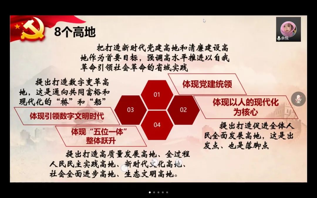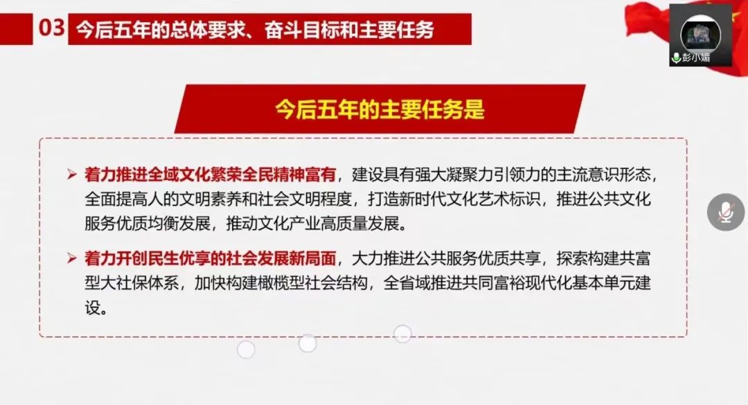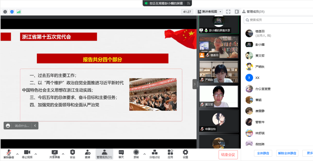 知心姐姐党支部结对行政党支部,会议伊始,由财神捕鱼 党委副书记、纪委书记、行政党支部书记彭小媚为同志们深入解读浙江省第十五次党代会报告。她将报告的四部分内容简要概述为成效、经验、奋斗目标和主要任务、机制保障,并一一展开相关内容的介绍与总结,思路清晰,言语精炼,在准确向同志们传达了报告精神的同时,鼓励同志们深入实践、勇于创新、敢于开拓。