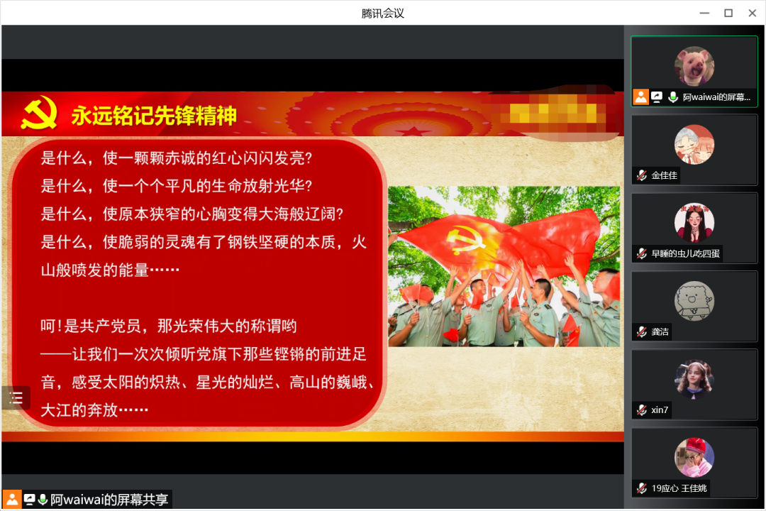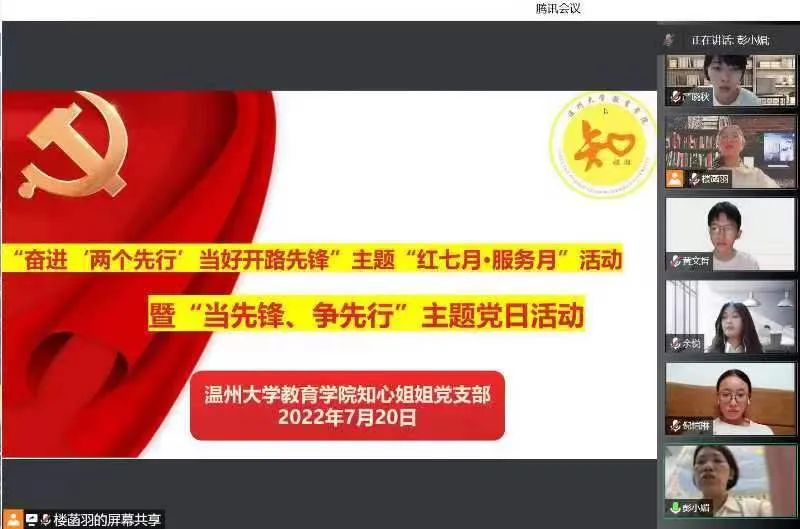2022年7月20日,知心姐姐党支部于腾讯会议上开展“奋进‘两个先行’当好开路先锋”主题“红七月·服务月”暨“当先锋、争先行”主题党日活动学习的成果交流汇报。
