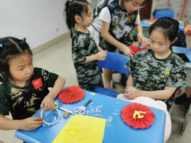 课堂中,老师运用语言的魅力绘声绘色地讲述了小英雄雨来的故事,孩子们听得入了迷,仿佛自己就是那位面对日军威胁但毫不畏惧的小英雄,眼中闪烁着崇拜与期望。绘本故事结束后,便进入到手工环节。孩子们积极地动起小手,画出金黄色的党徽图案,并将“党徽”附在了红色的立体圆盘上。在老师的帮助与同学们的互相协作下,一个个精美的手工作品从孩子们的手中诞生。最后,每个孩子都捧着自己的作品绽放出了满意的笑容。