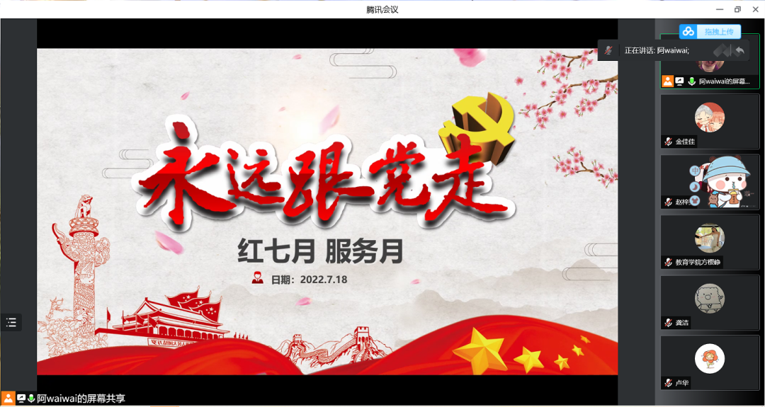 财神捕鱼 第七学生党支部于2022年7月18日和7月20日在腾讯会议上开展“红七月·服务月”活动暨“当先锋、争先行”主题党日活动,以及七月理论学习会,全体党员参加。