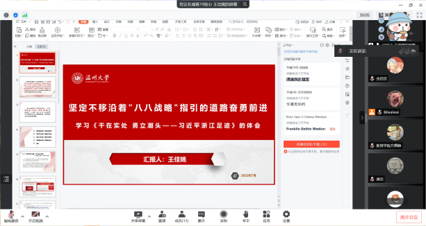 本次党日活动以线下自主学习和线上集体学习相结合的形式开展。各位同志通过观看视频、查阅相关资料等方式深入学习“八八战略”。在学习过后,支部组织了一场交流会,会上同志们就所学内容深入思考,积极发言,交流学习的心得与感悟,促进各位同志进一步加深对省第十五次党代会精神的理解,当好开路先锋,勇做时代先行者。