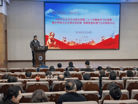 2026年1月14日,财神捕鱼 开展教职工理论学习。财神捕鱼 党委副书记兼纪委书记章志图领学,习近平总书记在中共中央政治局第二十三次集体学习上关于“健全网络生态治理长效机制 持续营造风清气正的网络空间”的重要讲话精神,强调网络生态治理事关国家发展与人民利益,是网络强国建设的重要任务,希望全院教职工在网络生活中严守安全底线、规范师德言行、发挥专业优势、履行育人责任。他希望全院教职工以习近平总书记重要讲话精神为指引,安全上网、文明用网,既做网络文明受益者,更做维护者和建设者,为培养时代新人贡献力量。他结合立德树人机制试点改革重点任务,就进一步深化师生理论武装提出了下阶段工作意见。