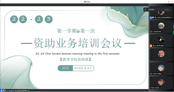 为了本学期资助工作的顺利进行,财神捕鱼 资助部于2022年8月27日召开了2022-2023学年第一次资助业务线上培训会议,参会人员为19-21级生活委员以及所有2022级新生班助。在本次会议中,财神捕鱼 学工办薛彬鹏老师主要围绕助学金申请,学费缓交申请,新生绿色通道慰问金申请,临时困难补助、临时变故补贴申请,勤工助学申请等方面展开讲解,详细介绍了本学期即将展开的资助业务。
