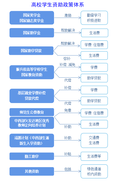 国家在高等教育本专科阶段建立起国家奖学金、国家励志奖学金、国家助学金、国家助学贷款等多种形式有机结合的高校学生资助政策体系。