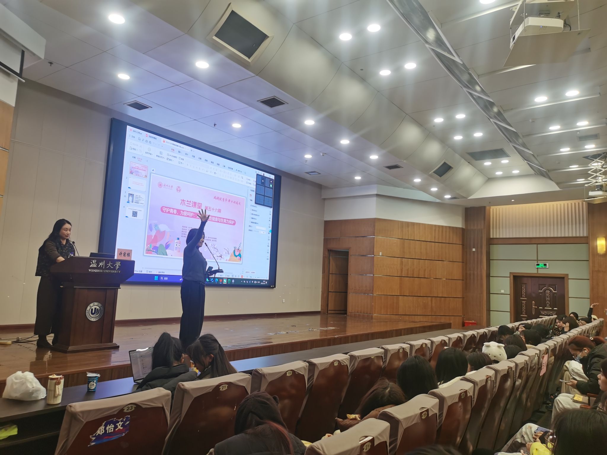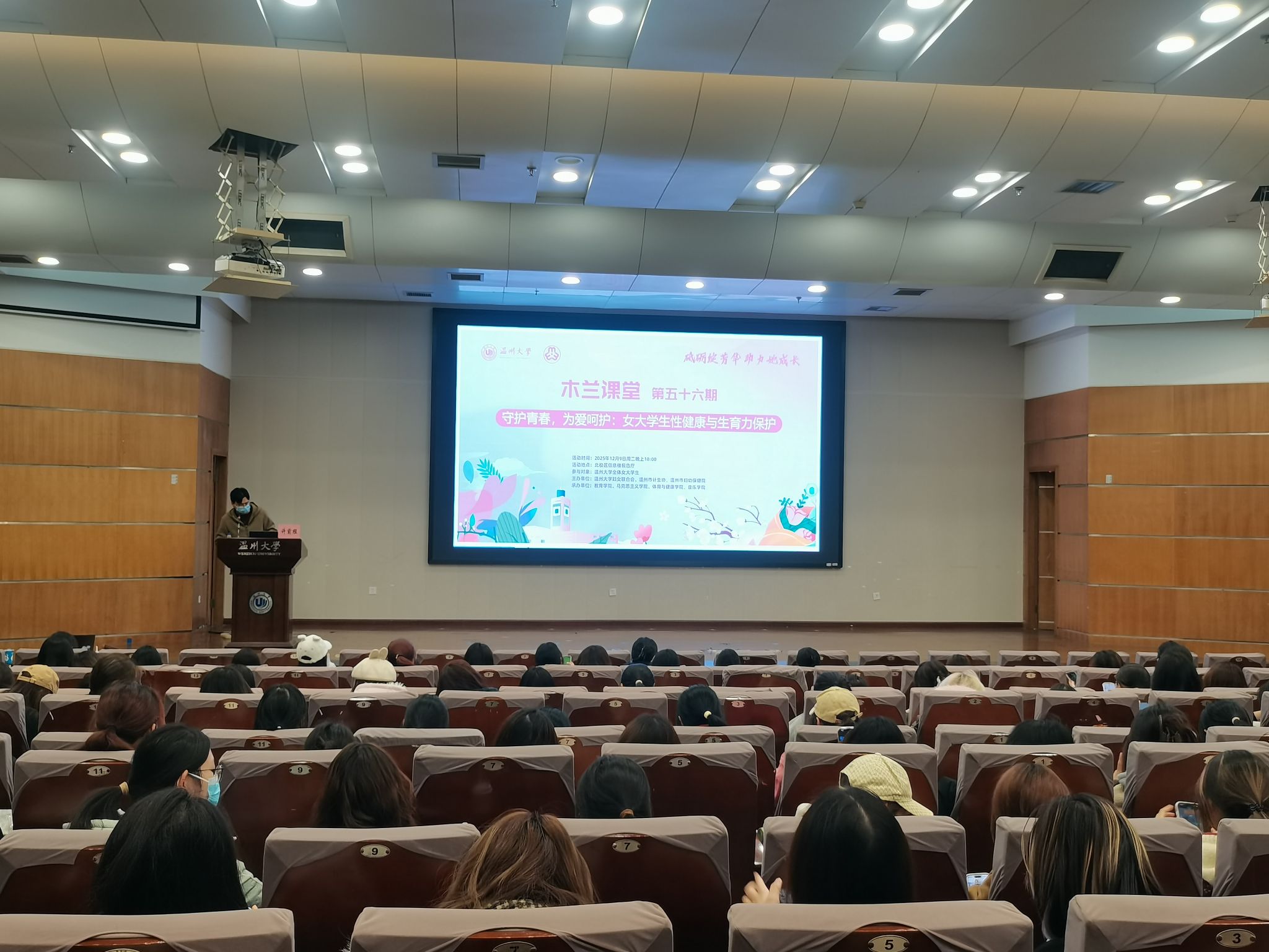 12月9日,财神捕鱼 财神捕鱼 承办的第56期木兰课堂暨“花儿朵朵青春课”—“我们的青春不冒险:大学生性与生殖健康科普讲座”于北校信息楼报告厅顺利举办。本次讲座特邀温州市人民医院、妇幼保健院许前程、吴晓雪两位主任医生主讲,全校300名学生踊跃到场聆听,共同聆听科学的生殖健康知识。