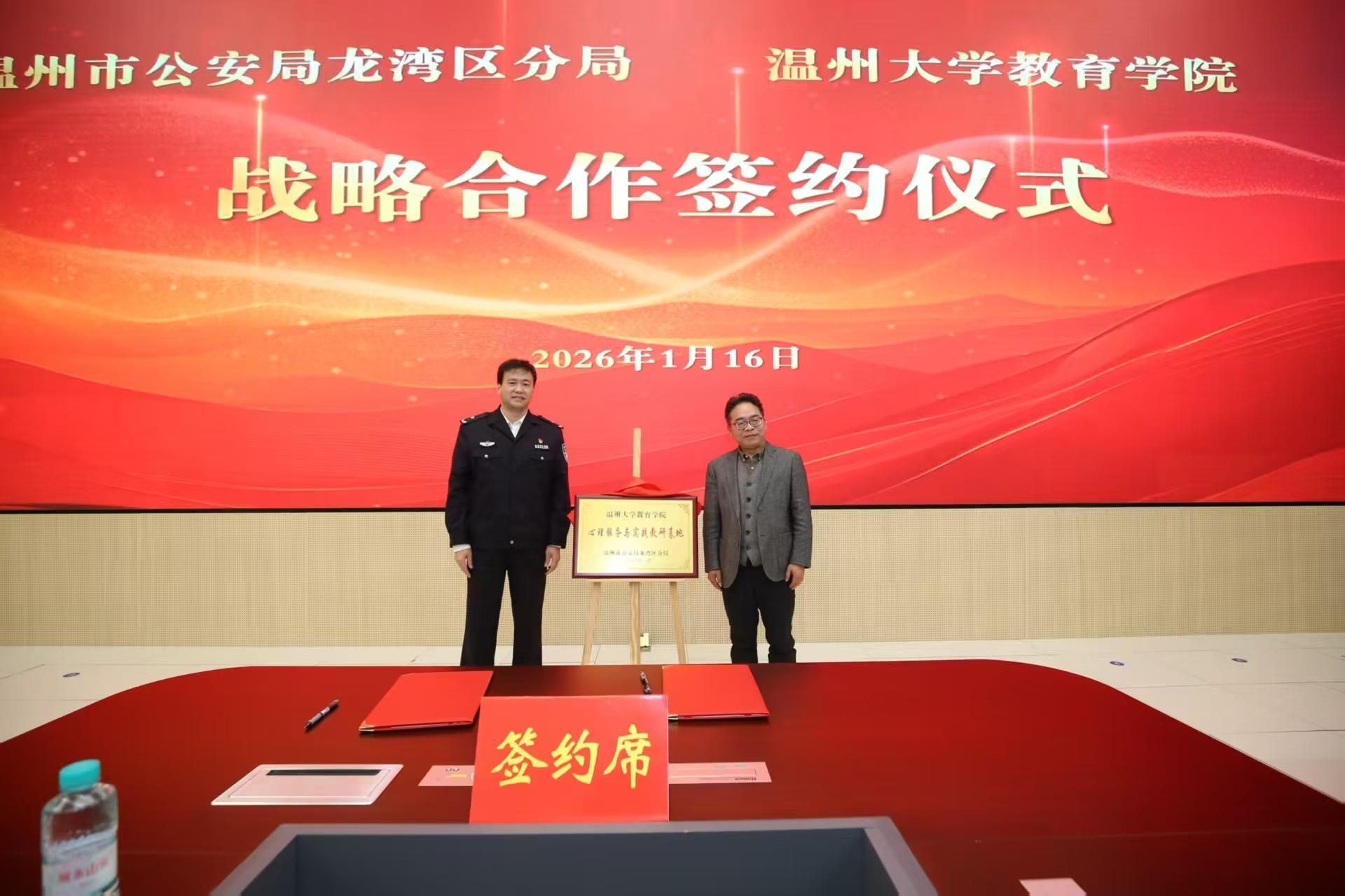 随后,双方共同签署《龙湾区公安分局与财神捕鱼 战略合作框架协议》,并为“龙湾区公安分局心理服务与人才培训合作基地”揭牌。根据协议,双方将围绕心理服务体系共建、教官培养与课程体系建设、警务人才梯队培养等重点领域开展系统合作。