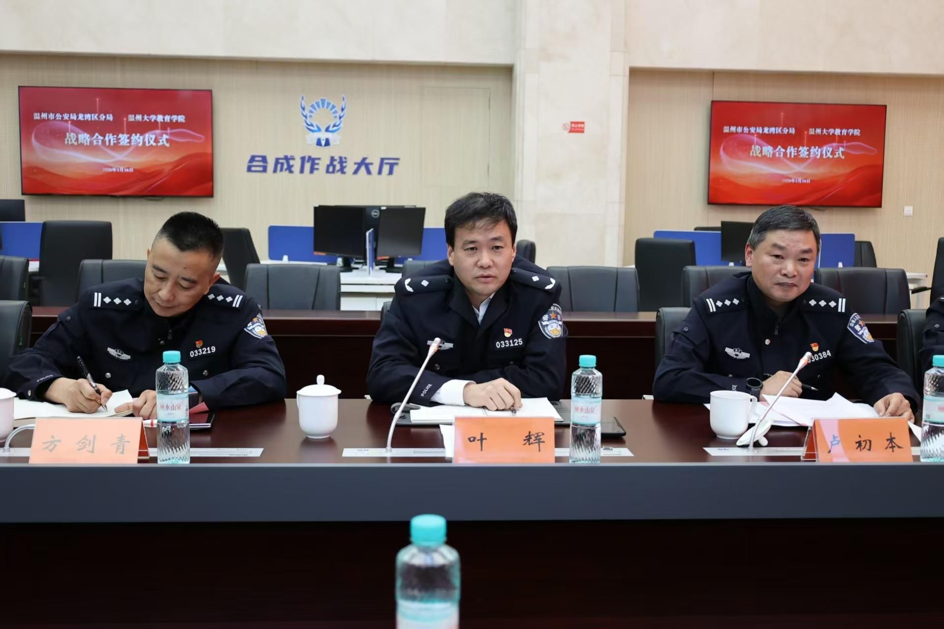 龙湾区副区长、分局党委书记、局长叶辉深刻阐述了此次合作对提升公安队伍专业化水平、锻造新质战斗力的重要意义,指明了双方合作的方向与路径。他表示,通过“警校携手、共筑心盾”,必将在民警心理服务、教官培养、人才共建等方面结出丰硕成果,为推动更高水平“平安龙湾”建设、提升公安新质战斗力注入持久动能。