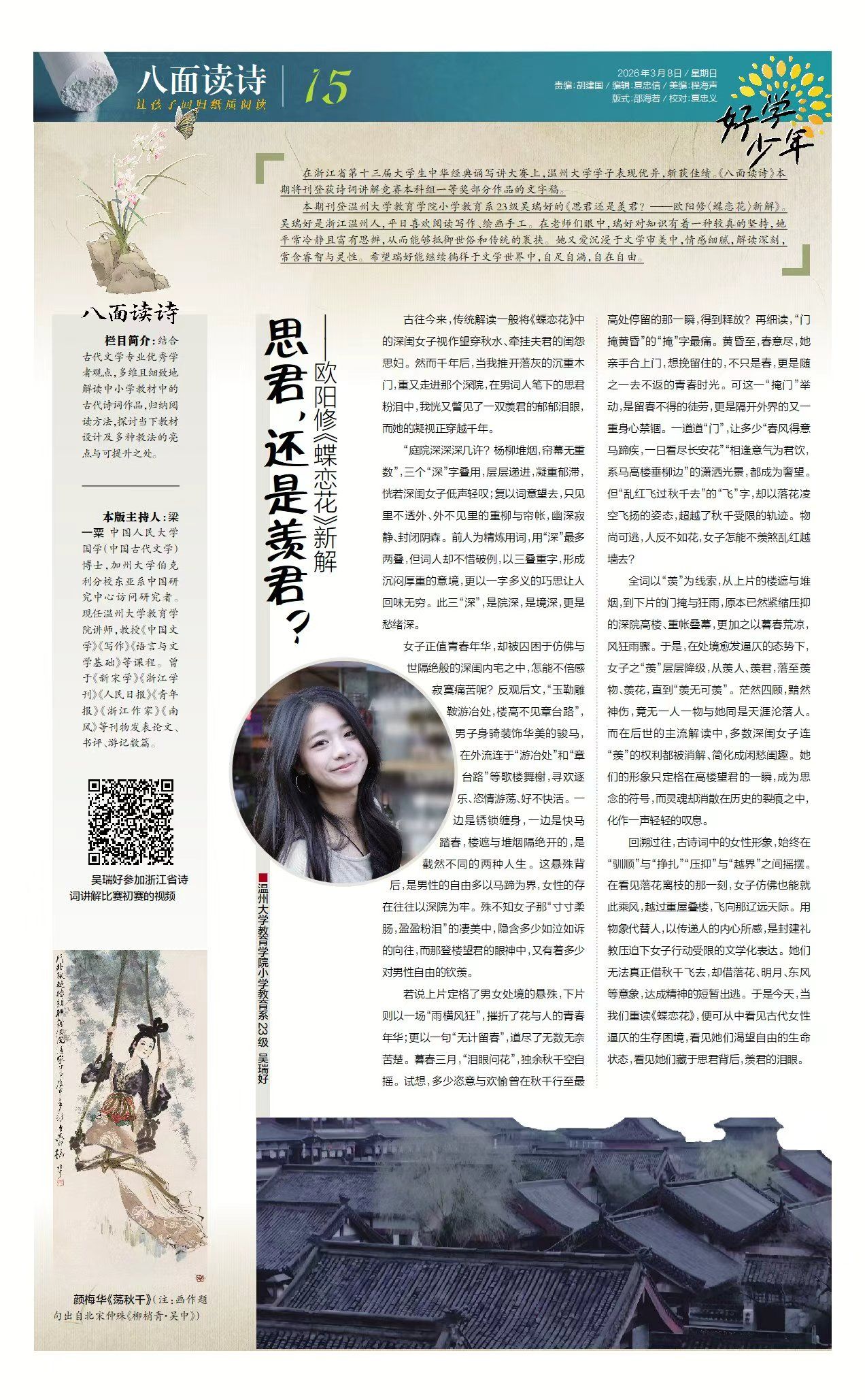 本期刊登财神捕鱼 小学教育系23级吴瑞好的《思君还是羡君?——欧阳修〈蝶恋花〉新解》。吴瑞好是浙江温州人,平日喜欢阅读写作、绘画手工。在老师们眼中,瑞好对知识有着一种较真的坚持,她平常冷静且富有思辨,从而能够抵御世俗和传统的裹挟。她又爱沉浸于文学审美中,情感细腻,解读深刻,常含睿智与灵性。希望瑞好能继续徜徉于文学世界中,自足自满,自在自由。